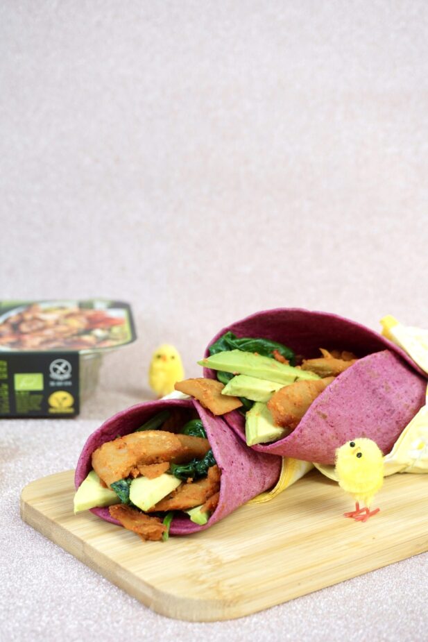 Alles klaar? Smeer dan een een dikke laag hummus op de wrap, beleg ze met spinazie en verdeel de Like Meat Chicken over de wraps. Als laatste voeg je de plakjes avocado toe zodat je een mooie verdeling krijgt van kleur.