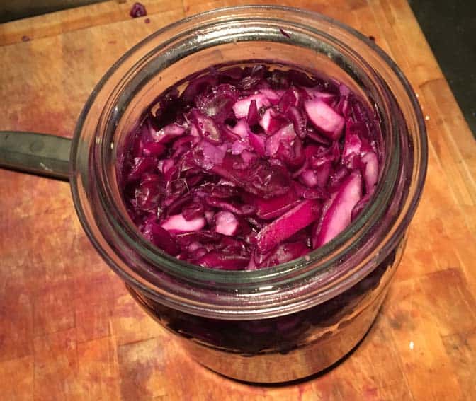 - Snijd de kool in heel dunne reepjes. Hoe dunner, hoe eerder ze fermenteren en klaar zijn. Snijden kan, zoals ik gedaan heb, met een koksmes of met zo’n ‘mandoline’ (heet het geloof ik) snijder. Als je rode kool snijdt, moet je geen snijplank gebruiken waar je zuinig op bent, doe ook gerust je favoriete vestje even uit; de rode kleurstof gaat namelijk niet makkelijk uit je kleren of van je plank. Houd twee bladeren heel en leg deze apart