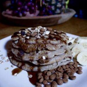 - Zodra de luchtbelletjes knapten, draai je het pannenkoekje om. Bak nog even op laag vuur — klaar! Herhaal met een nieuwe theelepel kokosolie totdat je genoeg hebt of het beslag op is.