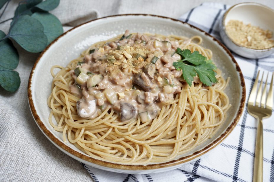 - Giet de spaghetti af en besprenkel met een scheutje olijfolie. Roer goed door. Zodra de saus begint te koken, schep je op. Geniet van je vegan pasta carbonara!